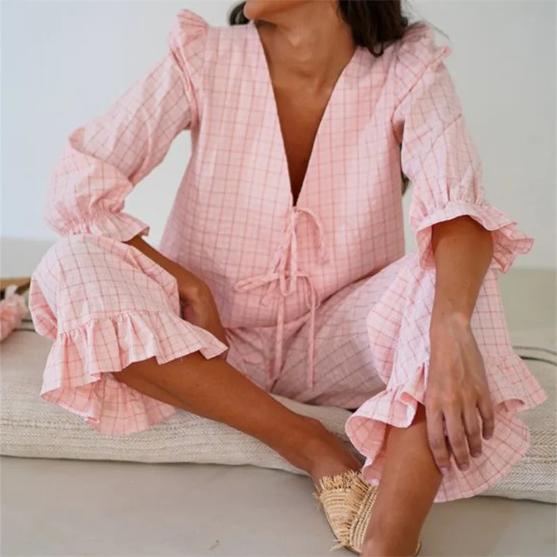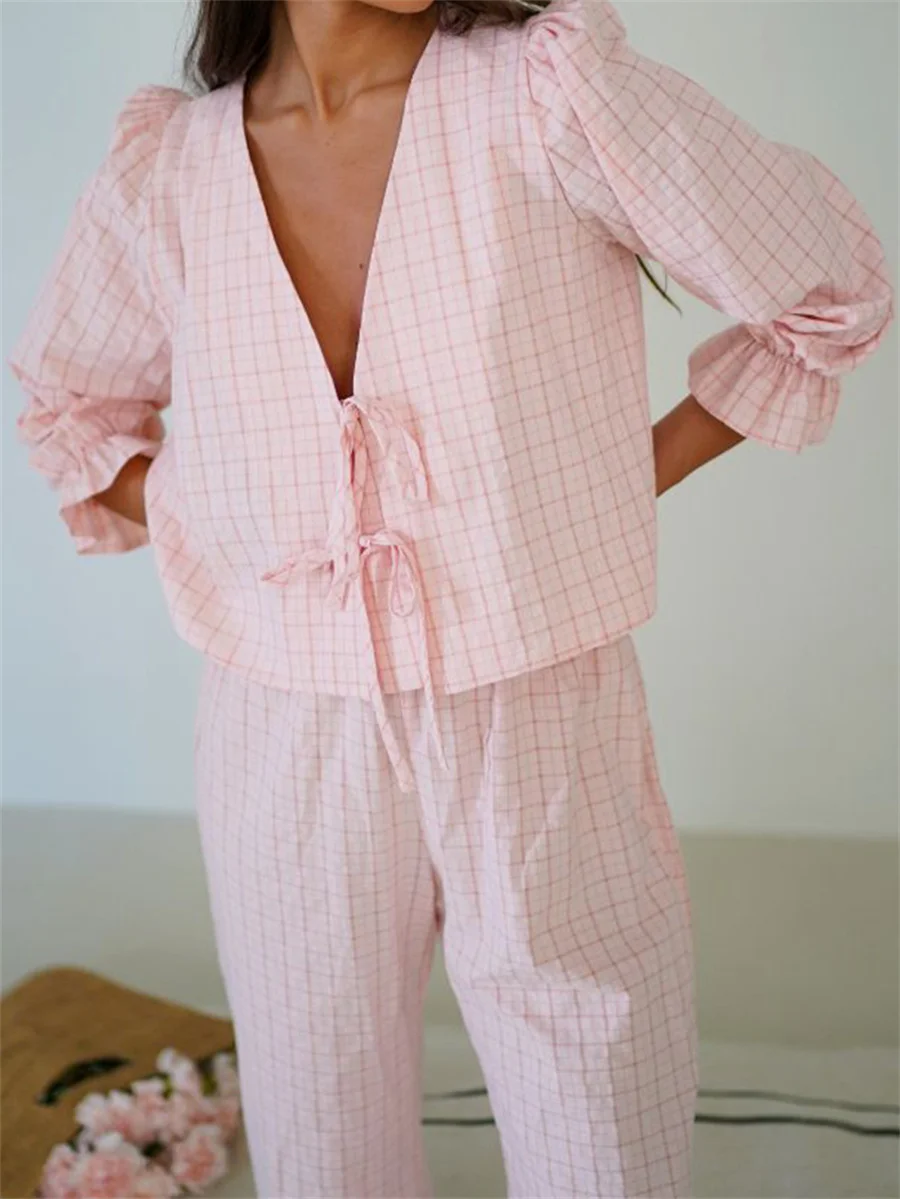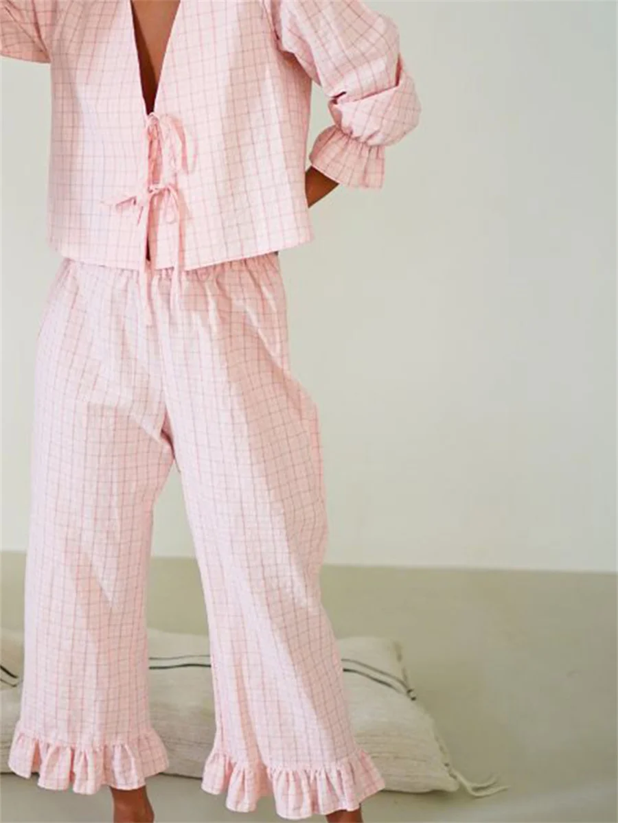 Women's Two Piece Outfits Set Long Sleeve Tie Front Top and Ruffled Wide Leg Pants Y2k Peplum Pajama Sets Homesuits