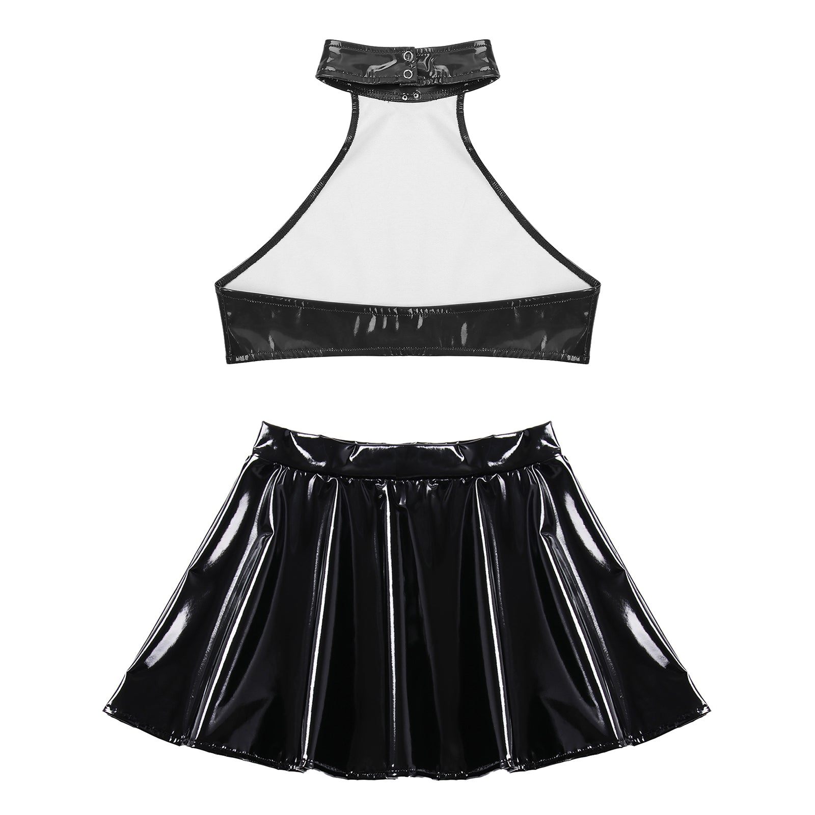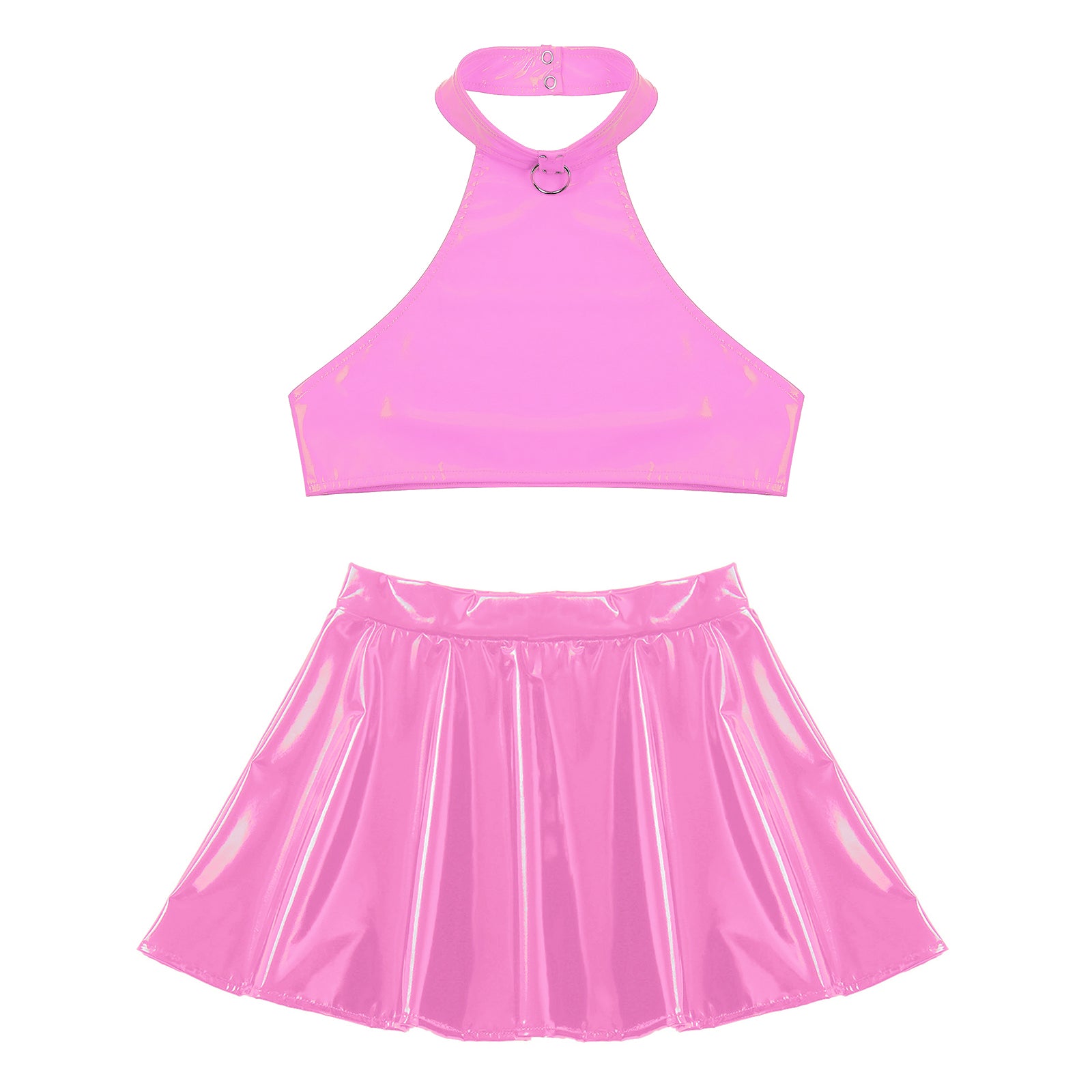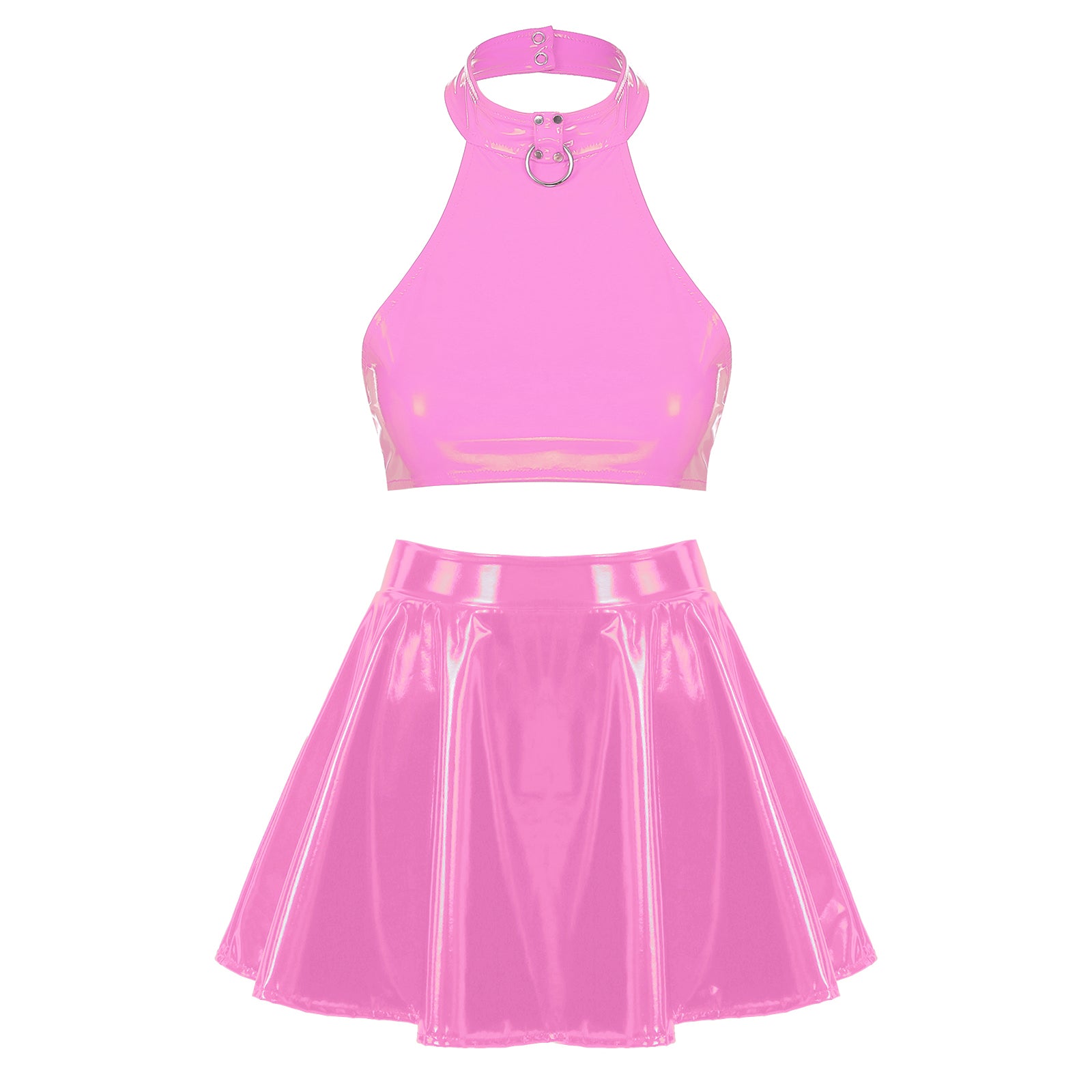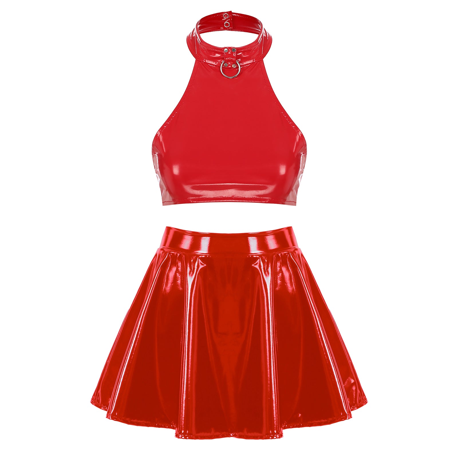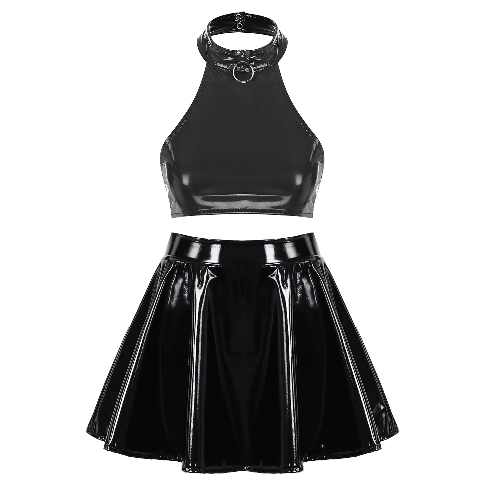 Womens Two Pieces Rave Party Outfits O Ring Halter Vest Tops Backless Patent Leather Crop Top with Invisible Zipper Flared Skirt