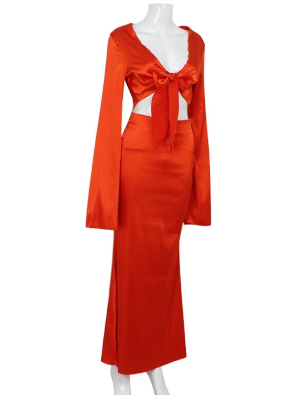 Women's Two Pieces Set 2025 Autumn Fashion Lace-up Long-sleeve Sexy V-neck Elegant Low-waist Gown for Runway Show Dress Sets